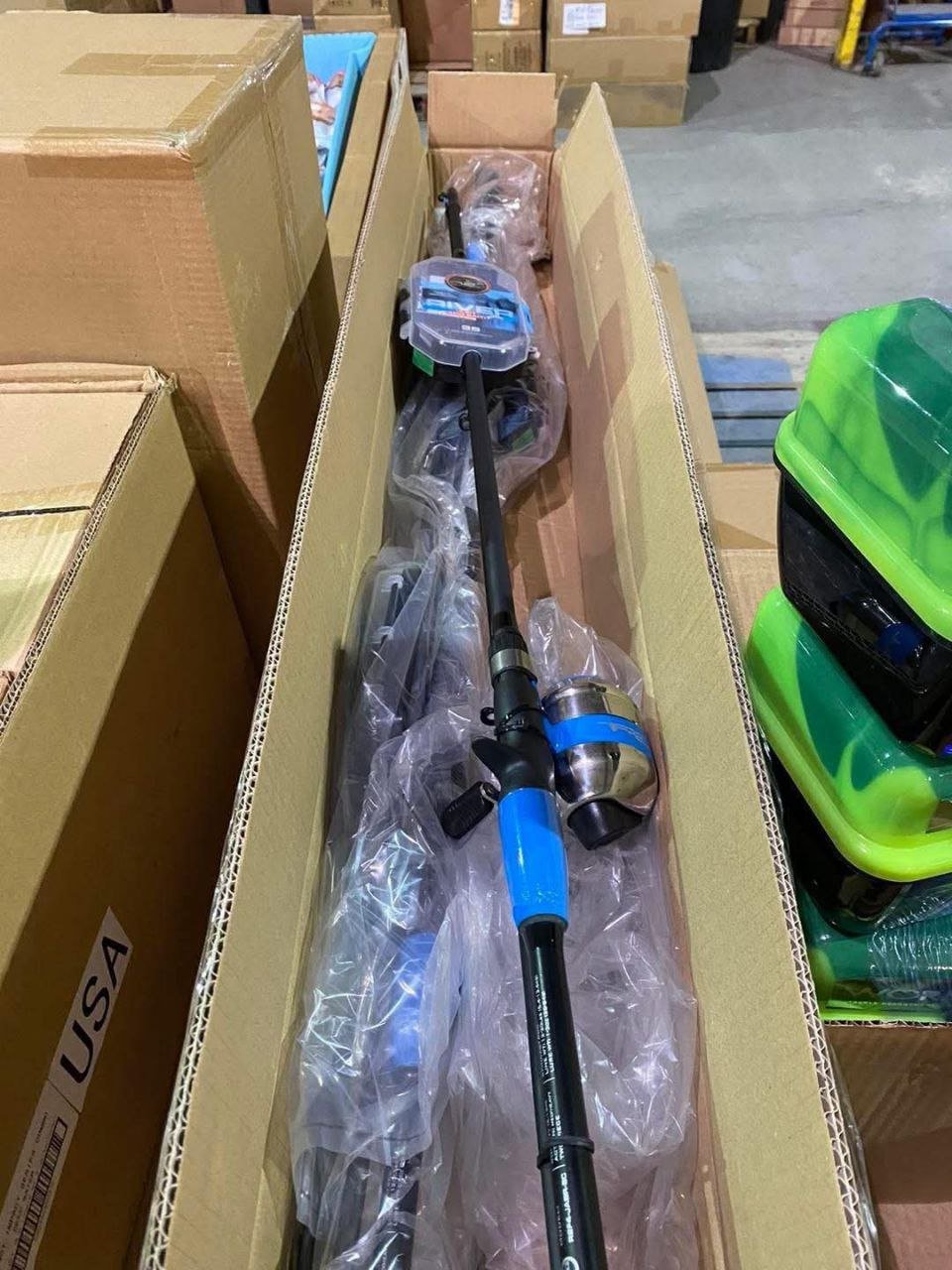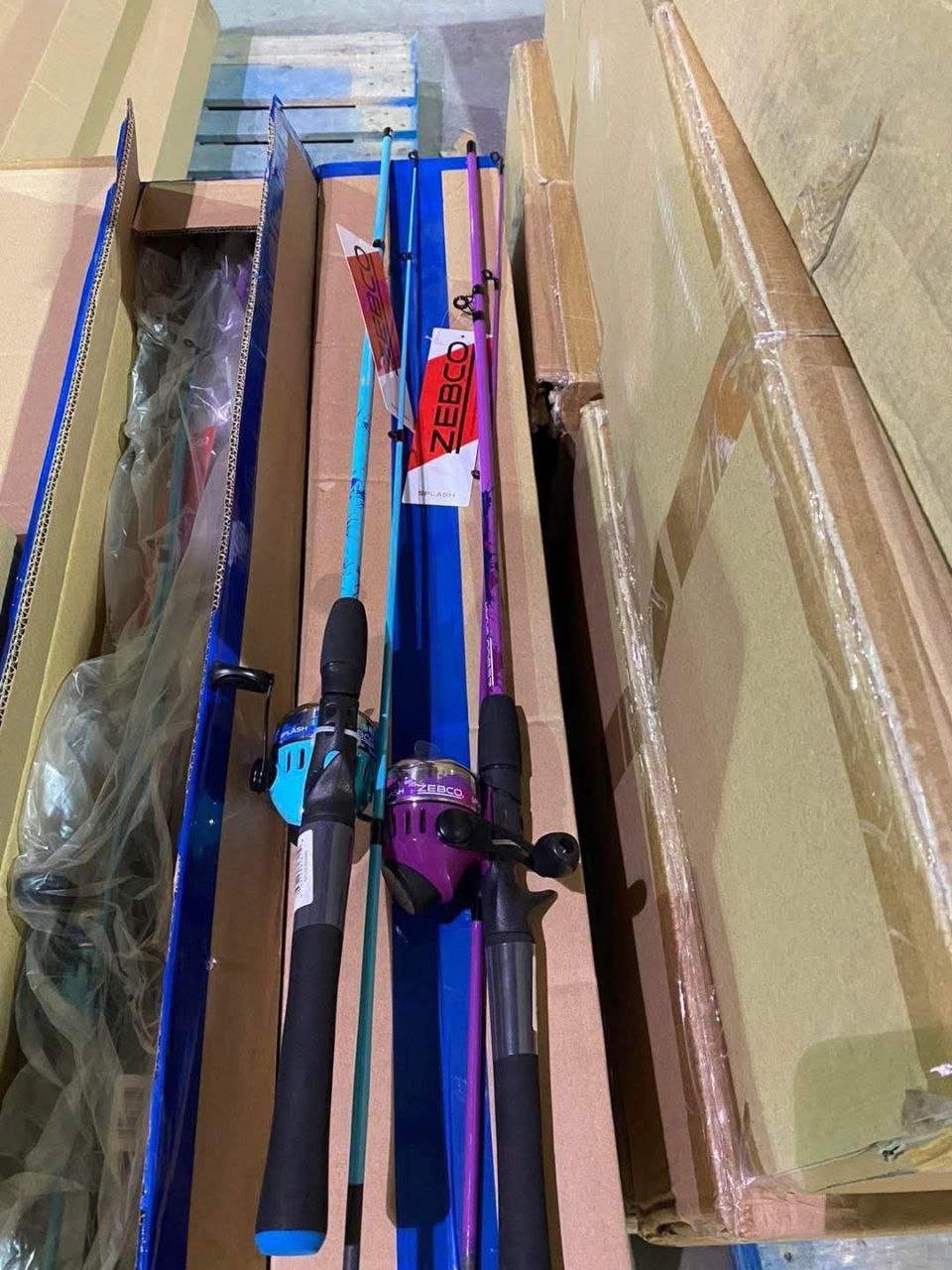 Fully loaded pallet of fishing gear and tackle, perfect for resellers, flea markets, tackle shops, and outdoor vendors.